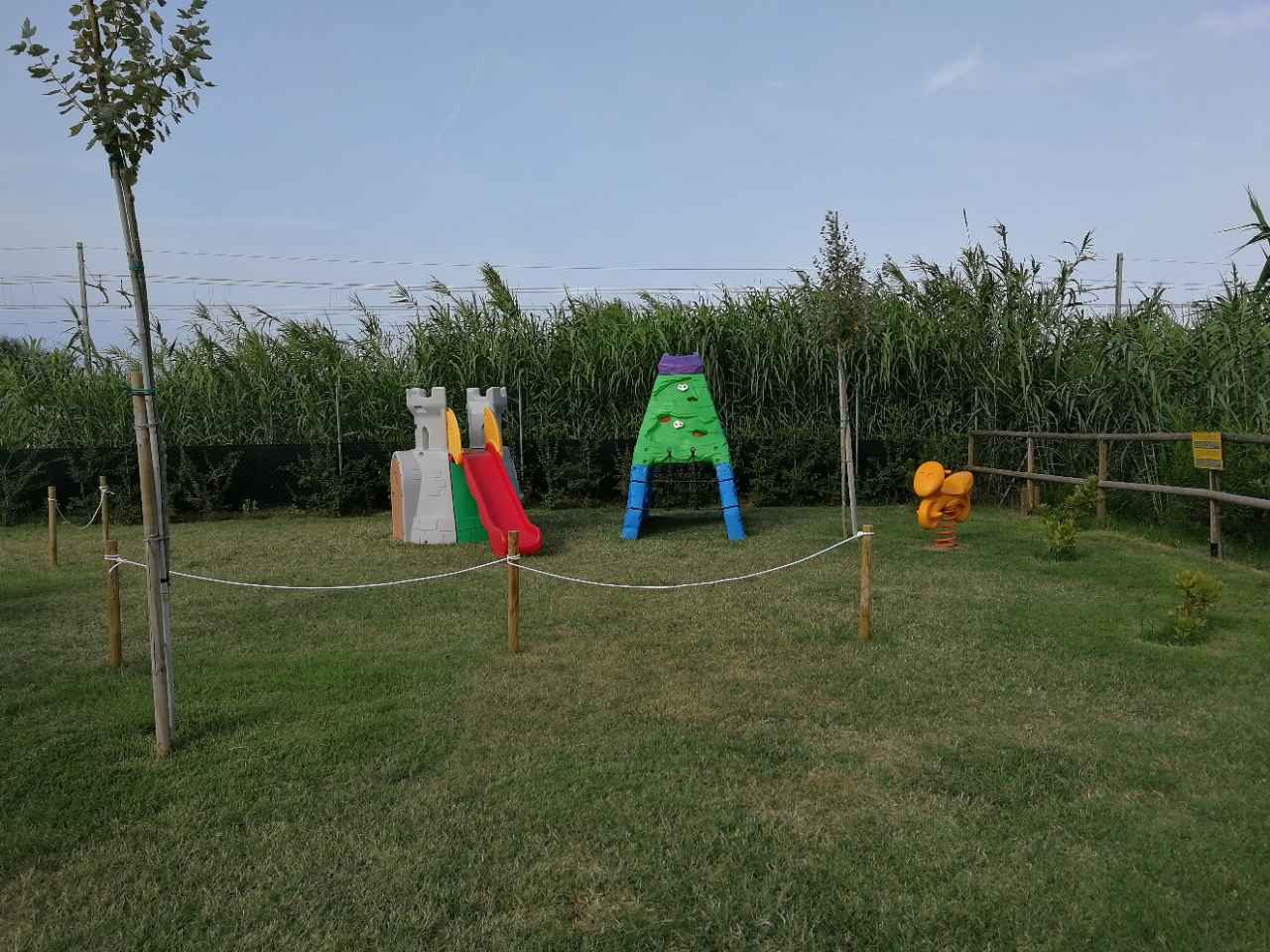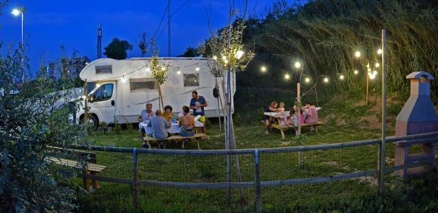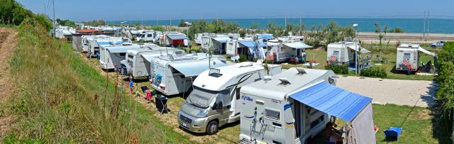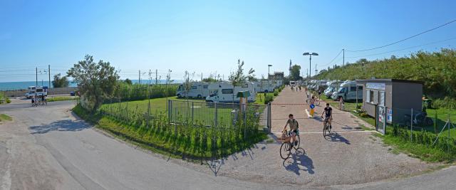 A 300 m dalle spiagge libere e attrezzate raggiungibili tramite sottopassaggio, area immersa con accesso automatizzato in entrata e uscita, illuminata, con 64 piazzole su erba, ombreggiate, con corrente e rete wifi gratuita. Servizi igienici anche per disabili, docce calde a pagamento, zona scarico delle acque reflue e carico dell'acqua potabile a pagamento, area relax.