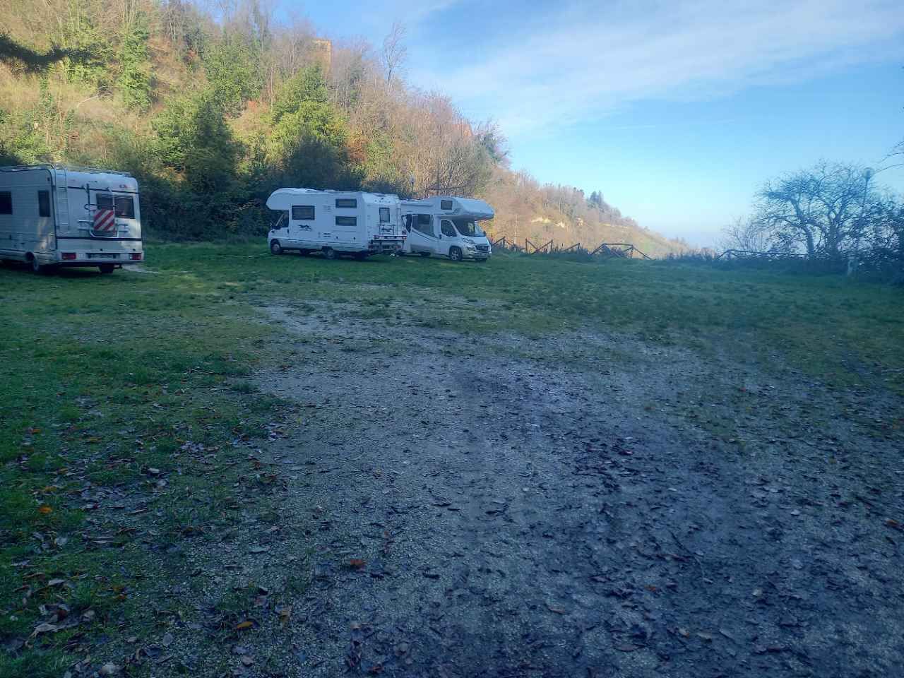 Area camper con scarico e carico acqua, ci sono due colonnine corrente ma non funzionano, tranquillo e ombreggiato - forse anche troppo in inverno. Non troppo comodo l'accesso alla via, forte discesa e di conseguenza forte risalita... Ma fattibile anche con camper di 7,20 m.