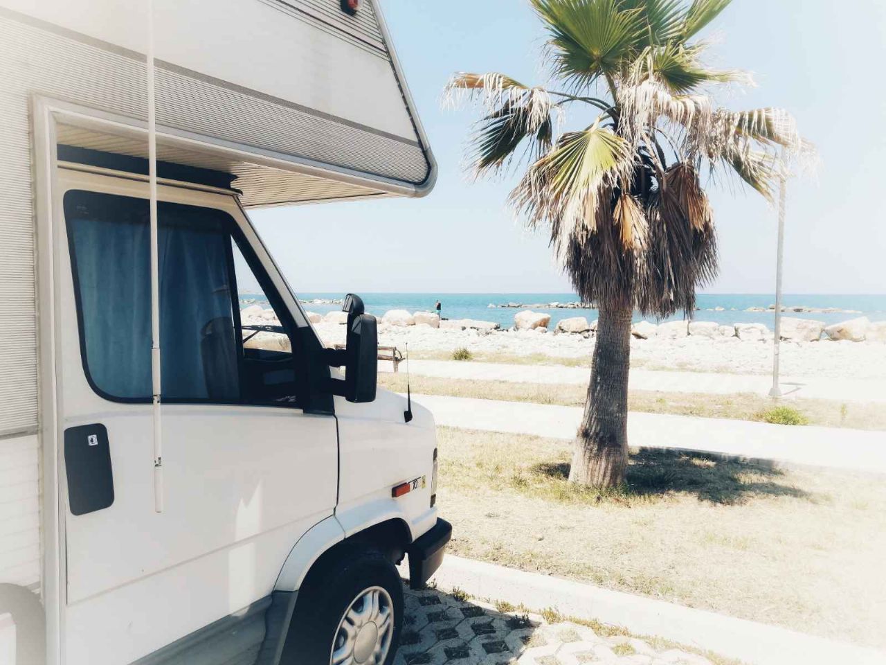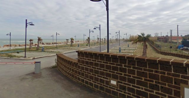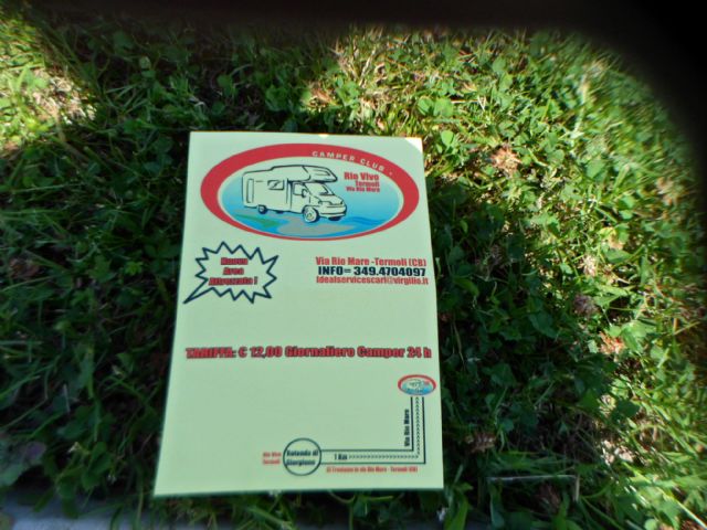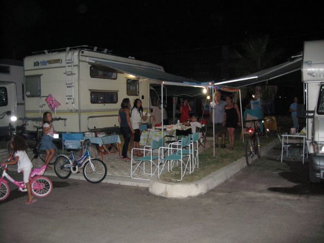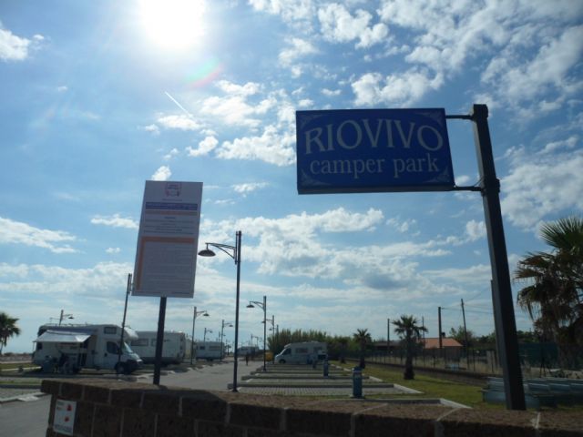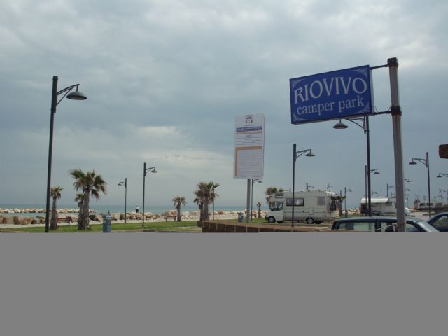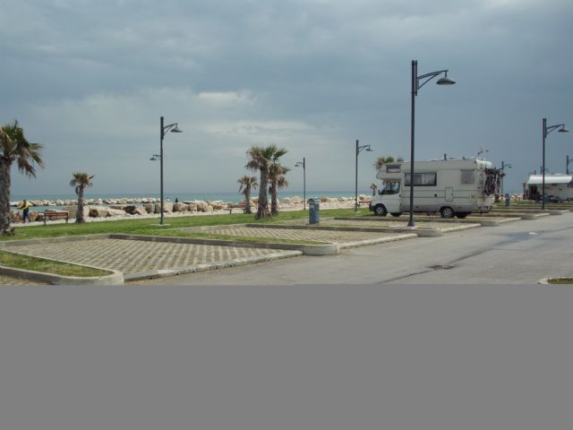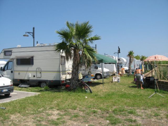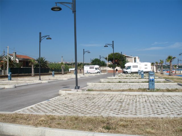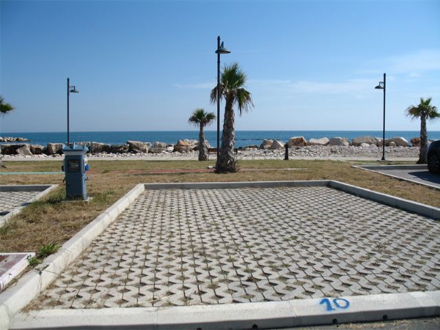 A circa 1 km dall'abitato (direzione sud) direttamente sul mare, area illuminata, non ombreggiata, la notte sbarra abbassata, 30 posti delimitati e pavimentati, allacciamento elettrico, carico acqua, scarico WC chimico, scarico grigie (a pagamento).