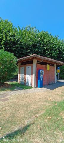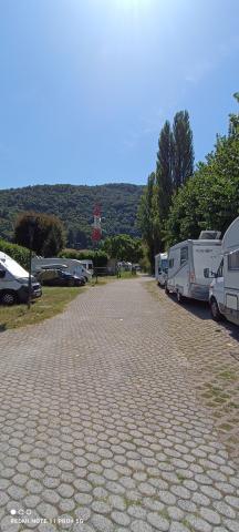 20/03/24. Punto sosta su terra, possibile caricare acqua, scarico per cassetta WC bagni, lavello per piatti e colonnina per corrente. Molto difficile scaricare le grigie, se non impossibile. Posto tranquillo e illuminato accanto al fiume con pagamento self service.