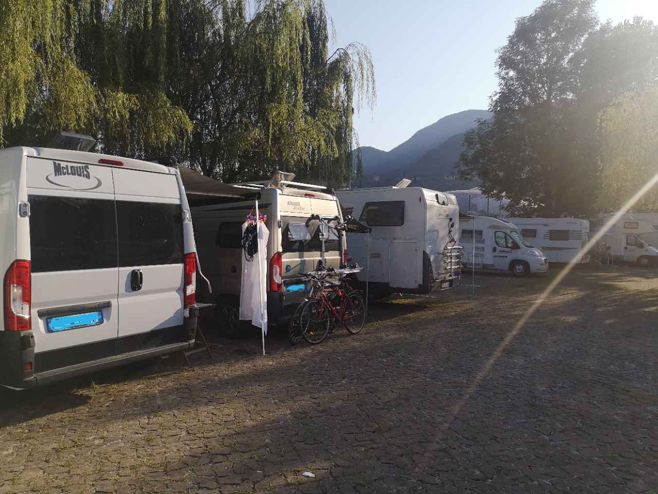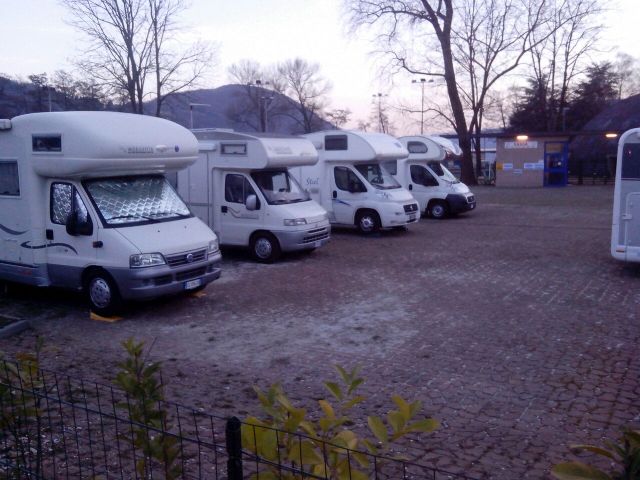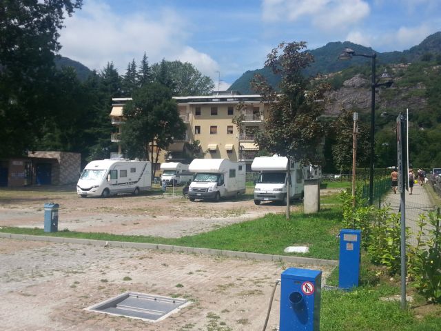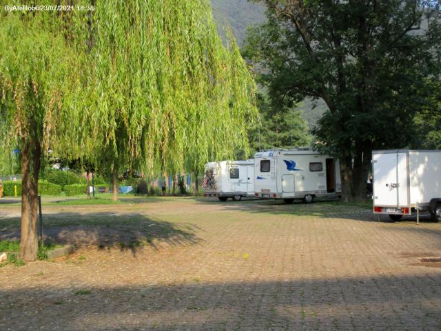 Niente di che a parte la posizione sul lago con tutto il lungo lago per arrivare in centro. C/S molto comodo, corrente e un blocco servizi con ciascuno una doccia e un bagno con la turca anche per le donne e alberi (salici piangenti) con il fogliame molto basso. In questo periodo si paga 30 x 24 h. (15 ogni 12 h.) personalmente troppo cara per quello che offre, basterebbero 15 max 20 euro. Volendo oltre ai parcheggi sul lungo lago ce ne sarebbe uno bello grande alla fine della via a destra rispetto all'area sosta visto che comunque con 5 euro si può entrare per fare C/S.
