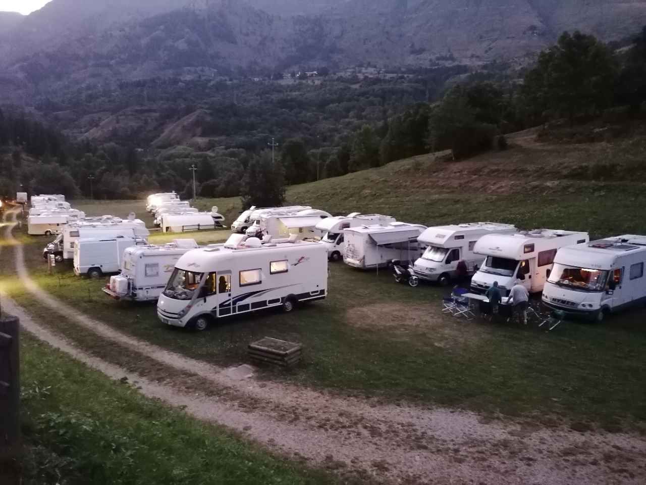 Area su prato vicina all'albergo/ristorante (dove si effettua pagamento) ed il laghetto, dispone di ampio spazio per camper non delimitato con allaccio elettrico, tavolini, giochi bambini, barbecue, camper service.
