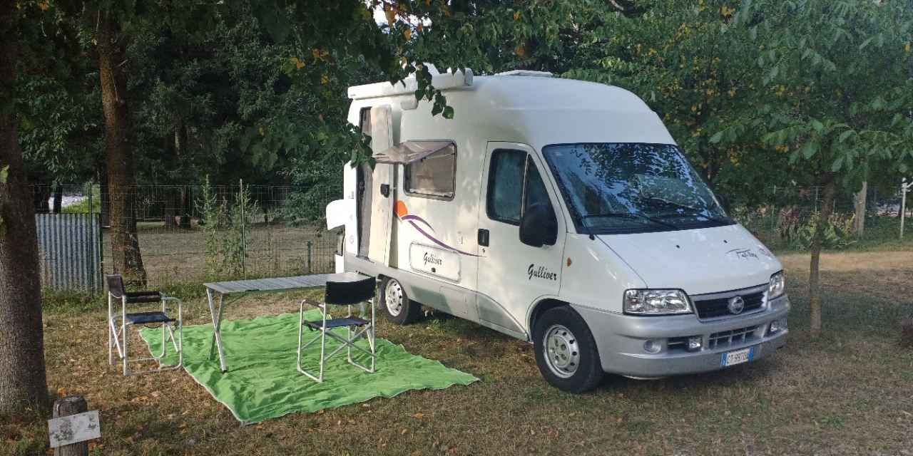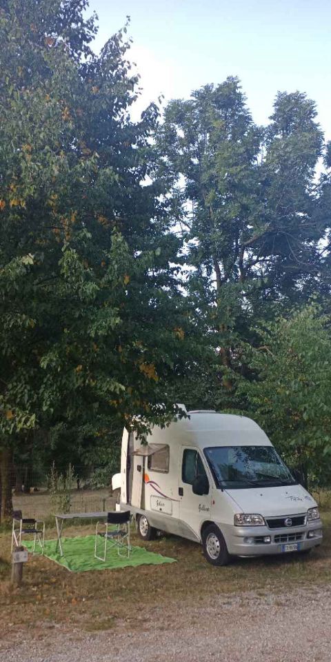 Illuminata, 2 colonnine per carico acqua, scarico grigie/nere, area giochi, ristorante con piatti da asporto.