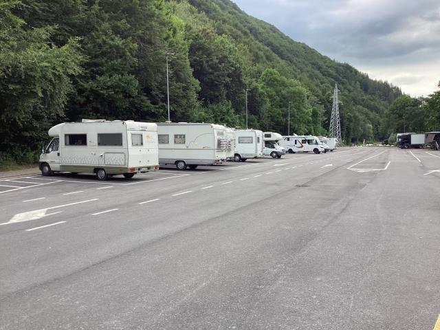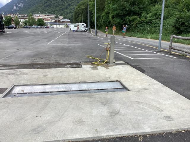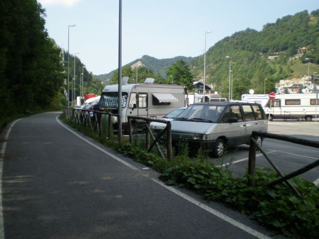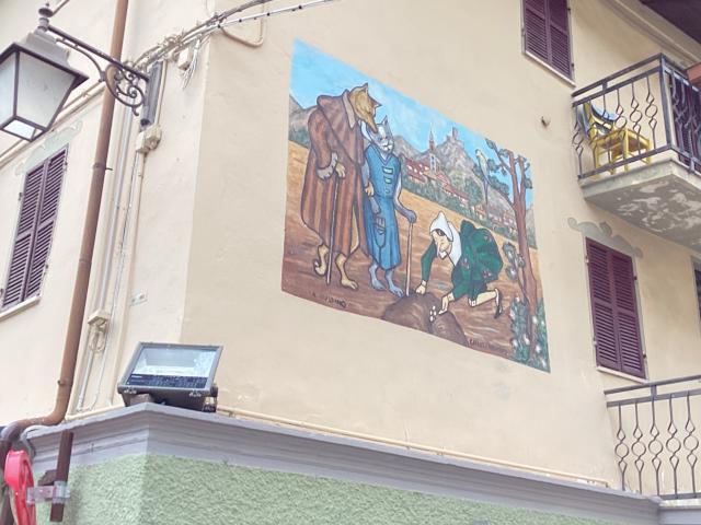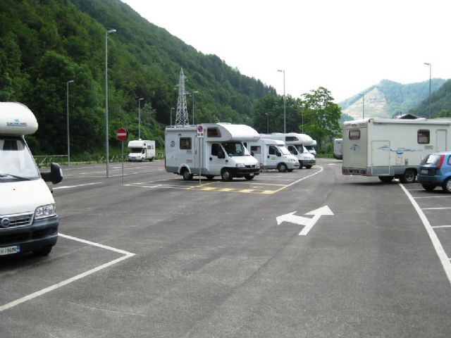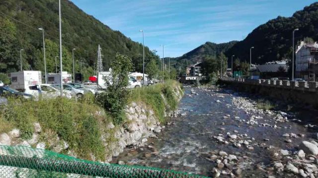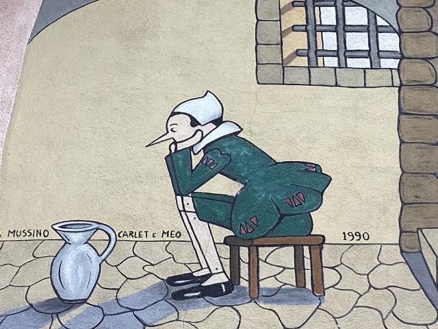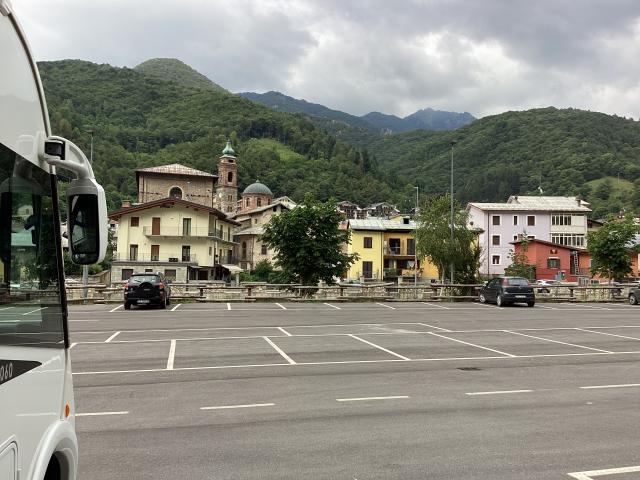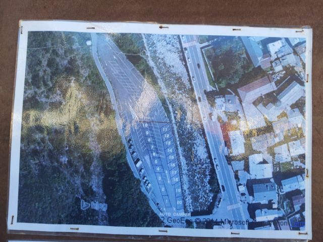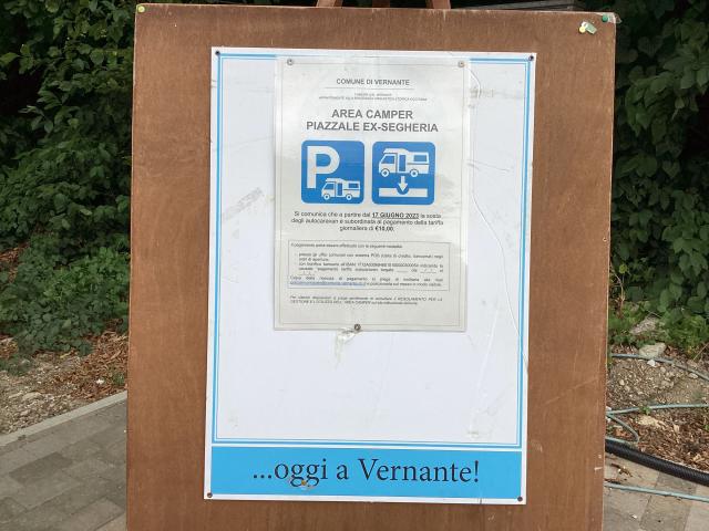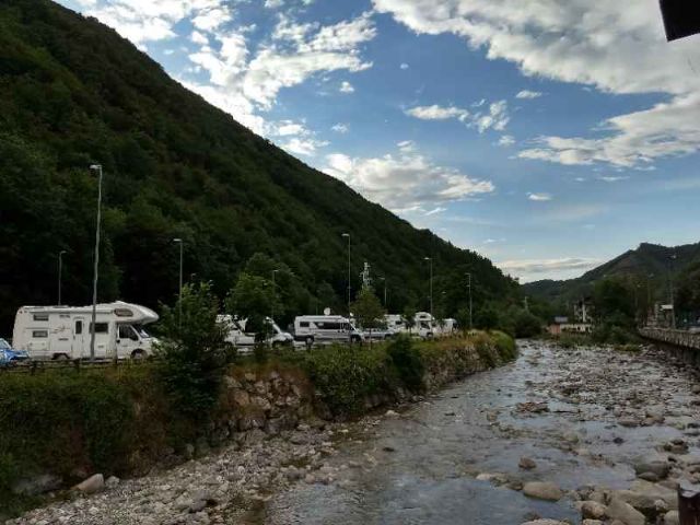 Paesino con murales sulla favola di Pinocchio, area sosta a pagamento (bonifico o in comune) nei pressi dell'area verde oltre il torrente con 17 ampi stalli per camper (apertura tendalino), allaccio elettrico e area camper service.
