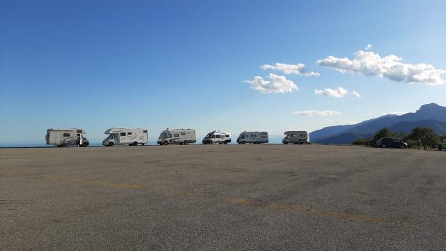 Al termine del parcheggio P2, punto sosta assolato su piazzale asfaltato, con vista panoramica, gestito da Wing Over Bar, 8 posti con allaccio elettrico e altri 50 senza.