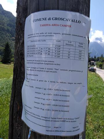 Ampia area comunale vicino al fiume con due colonnine di allaccio elettrico e idrico (4 allacci per colonnina) fruibili tramite una chiavetta ricaricabile che si pu� prendere presso gli uffici comunali.