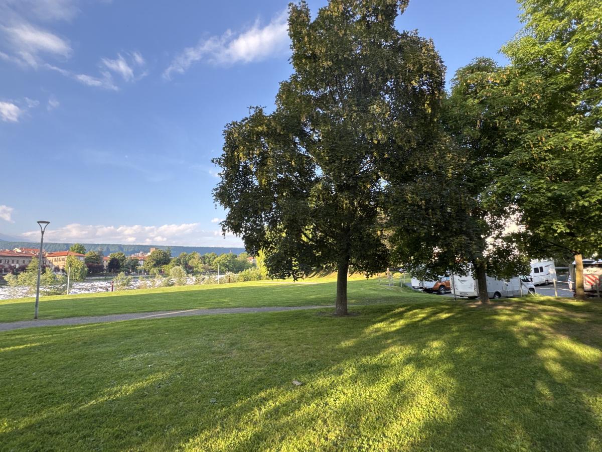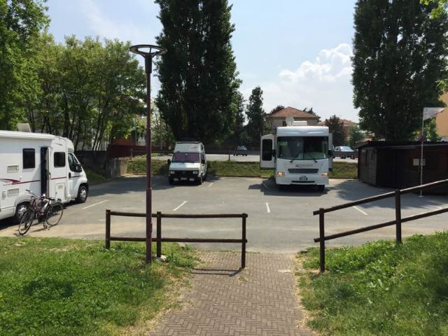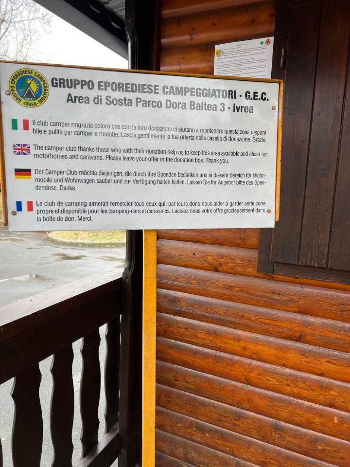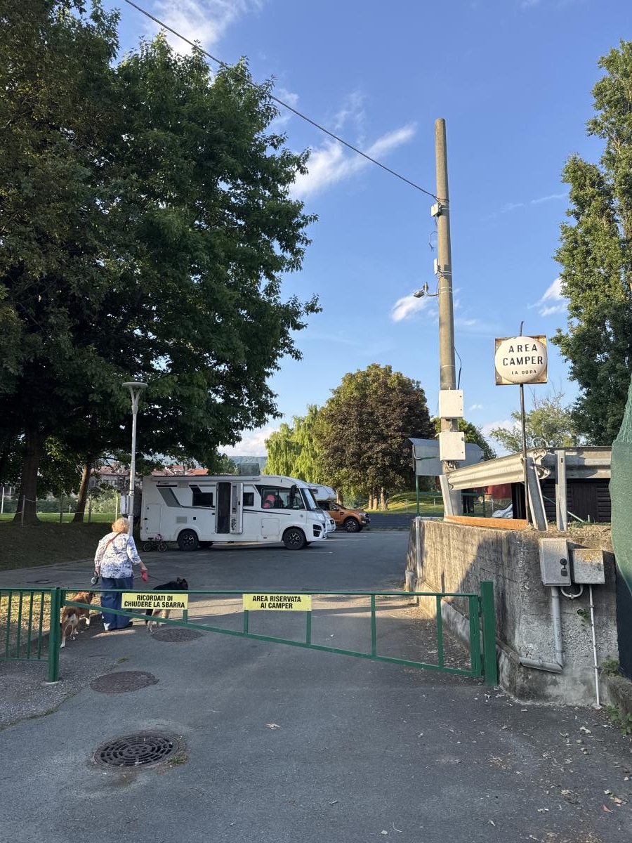 Una vera oasi quasi in centro ad Ivrea. Silenziosa e tranquilla con ottimo caper service. Non c'è fornitura di energia elettrica. La sbarra si apre e si chiude a mano. Il centro di Ivrea si raggiunge comodamente a piedi. Non c'è una tariffa ma viene chiesto di lasciare un'offerta libera per la manutenzione dell'area.