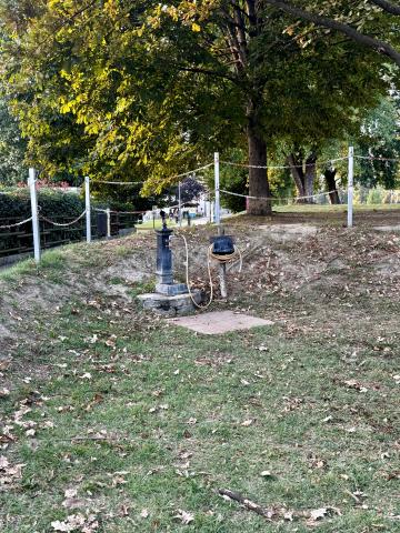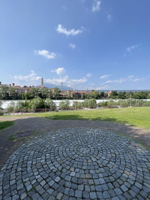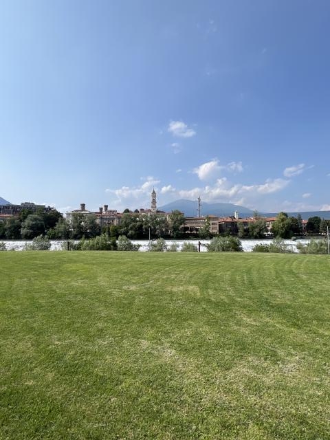 Piccola aria ben tenuta, curata, con circa 8/10 posti sosta; Camper Service, no allaccio elettrico, a ridosso del fiume, collegata al centro con comoda pista ciclabile