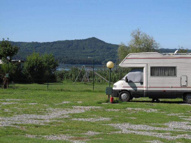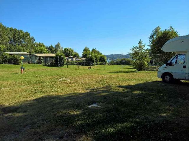 Area sosta e campeggio con accesso al lago, 40 piazzole dotate di allacciamento elettrico, su fondo in erba, pianeggianti, parzialmente ombreggiate e illuminate.