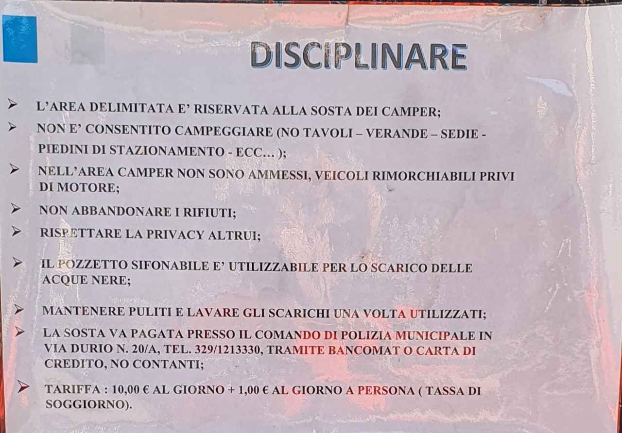 Il disagio maggiore è che per pagare (10 € per 24 ore più 1 € a testa per tassa di soggiorno) bisogna recarsi alla sede del comando dei vigili che accetta solo pagamento con POS, orari di apertura tutti i giorni dalle 9 alle 12, eccetto domenica. Lo consiglio.