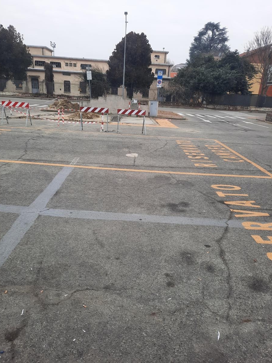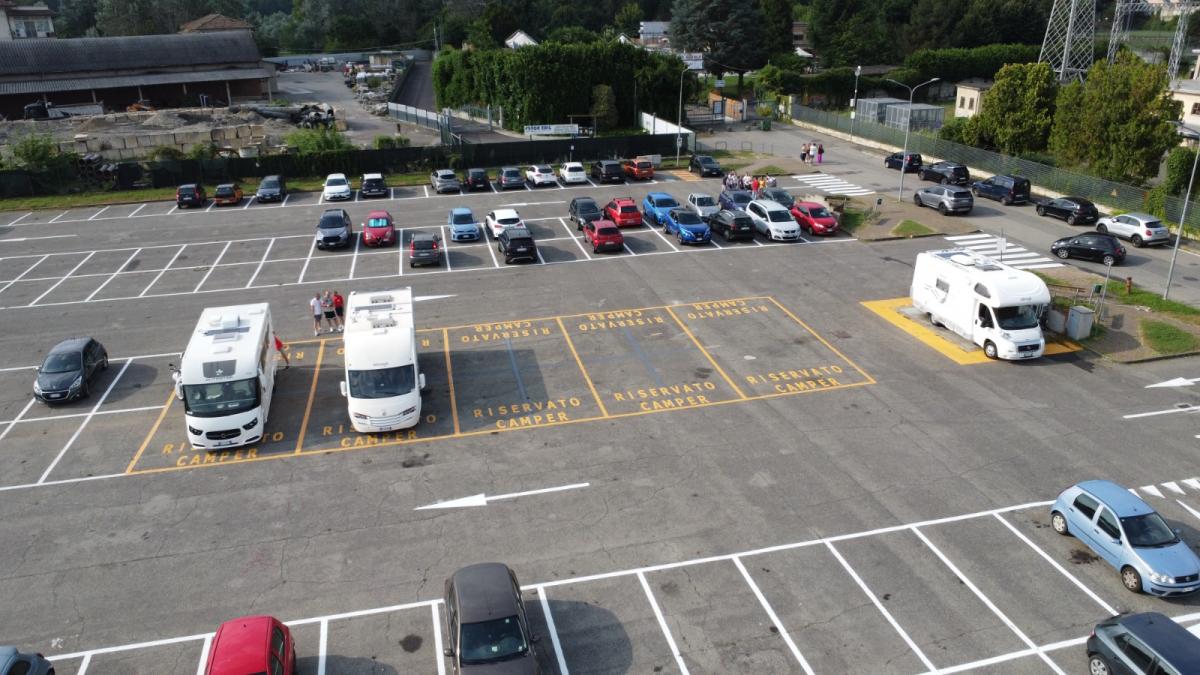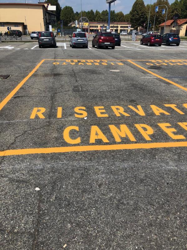 Di fronte al supermercato Carrefour, ampio piazzale su cemento condiviso con Piscina e impianti sportivi, con 5 posti camper, pianeggiante, senza ombra, con carico/scarico.
