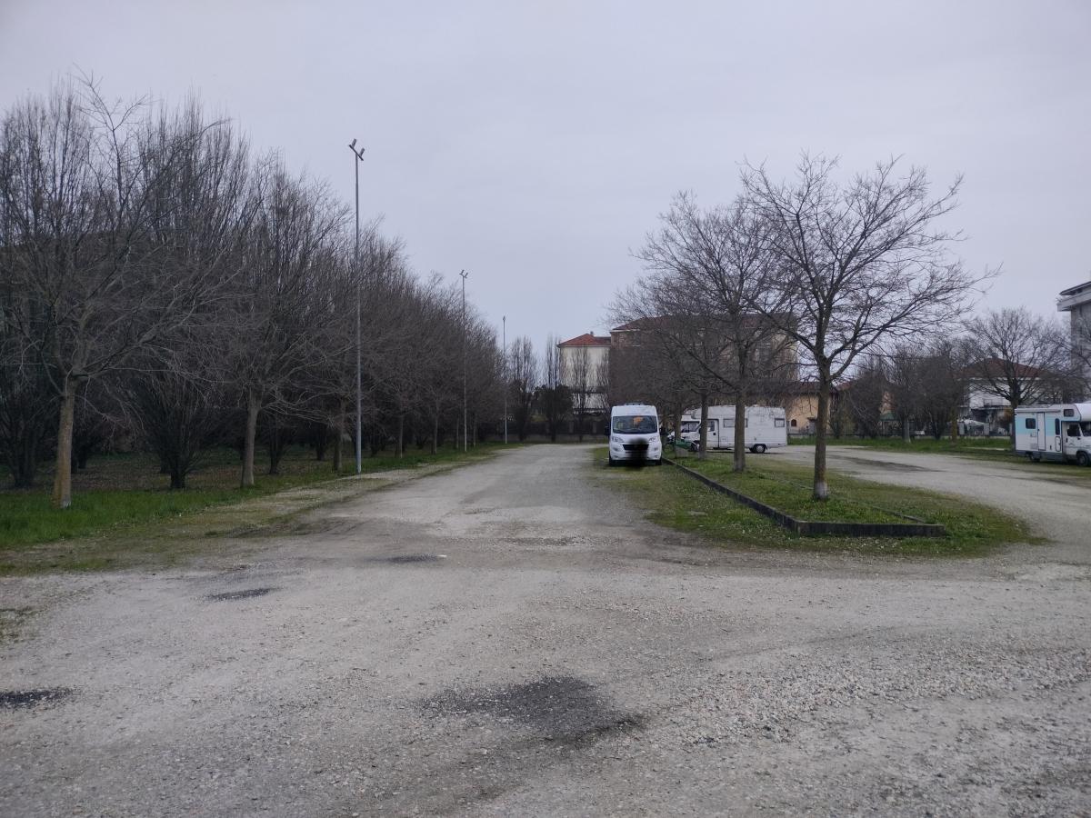 Grande area camper in piano, illuminata, ma le colonnine elettriche sono utilizzate dai "residenti" bisogna telefonare alla Polizia Comunale per avvisare dell'arrivo ma mi chiedo se poi controllano! Ci sono camper molto vecchi e auto. Il posto è un po' isolato e non proprio comodo per il centro.