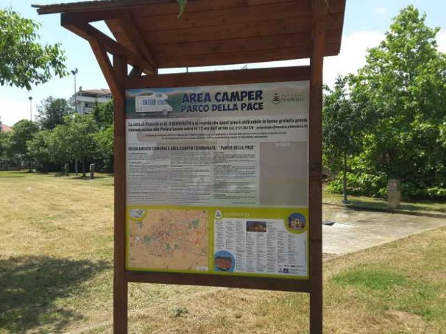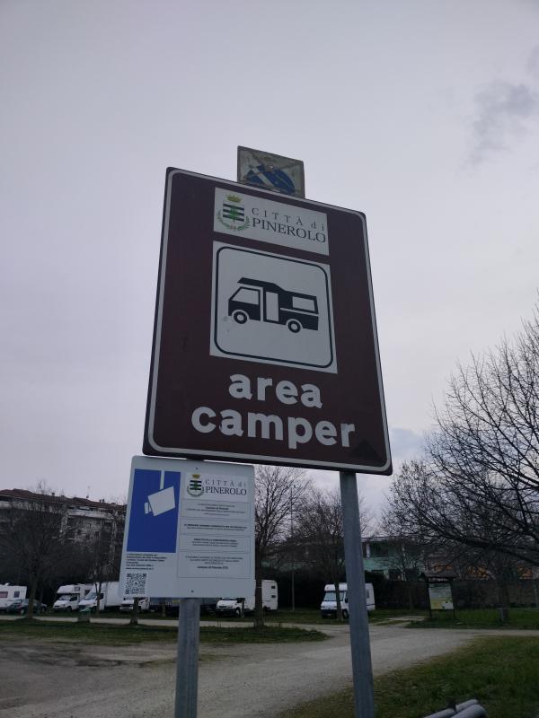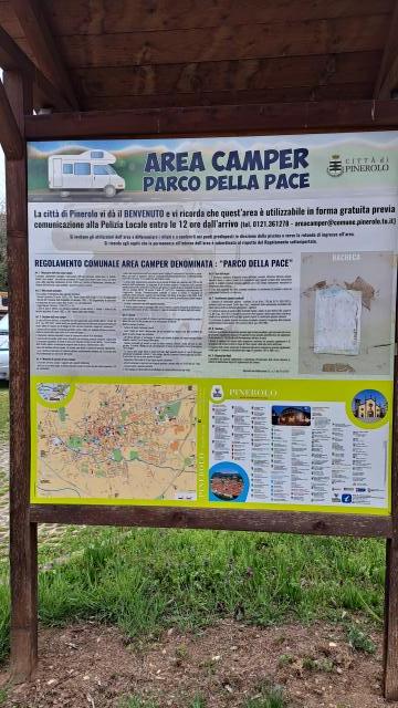 Area sosta ombreggiata e tranquilla completa di tutti i servizi gratuiti. Si trova a 300 metri dalla stazione di "Pinerolo olimpica" per cui è validissima per raggiungere Torino (priva di campeggi validi) in 40 minuti. Foto attuale che rispecchia la realtà. Consigliatissima.