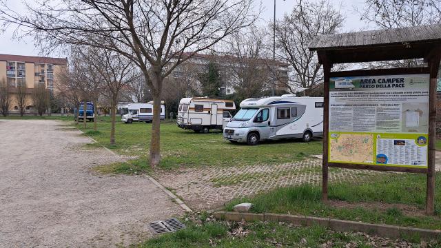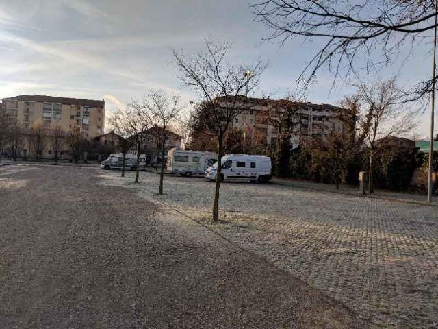 Area camper potenzialmente da 5 stelle. sufficientemente pulita piazzole ampie su autobloccanti. Mi fermo alcuni giorni. Al terzo salta la corrente. In molti siamo 7 camper telefoniamo alla Polizia Municipale. Senza apparenti positivi risultati. Debbo evidenziare che l'area camper conglobata in un centro sportivo ha una superficie di oltre 5000mq. La notte è completamente al buio nonostante si evidenzi una potenziale poderosa illuminazione a fari che invece rimane spenta. L'area dovrebbe essere video sorvegliata. Fruibile sia lo scarico acque grigie che wc. possibile fare riferimento di acqua potabile. Speriamo in più attenzione da parte della municipalità. Tranquilla la notte dopo le 23 stante il via vai dei fruitori gli impianti sportivi.