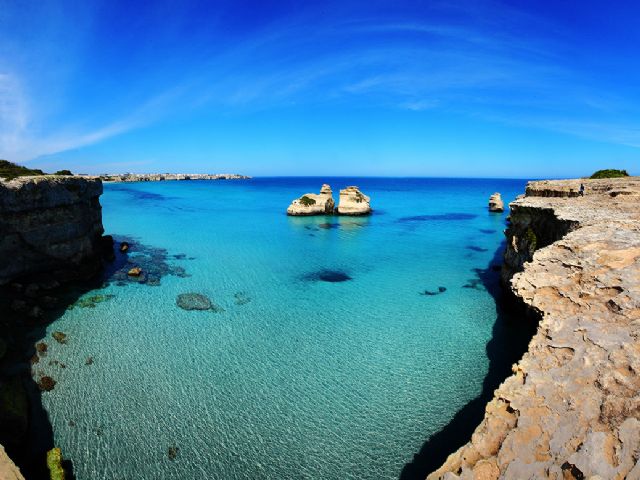Torre dell'Orso e cale sabbiose che si alternano a grotte e piccoli anfratti, si estende per circa 900 m., tra due scogliere, da una delle quali si ammirano i faraglioni chiamati Le Due Sorelle.