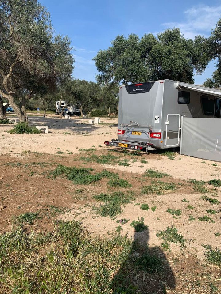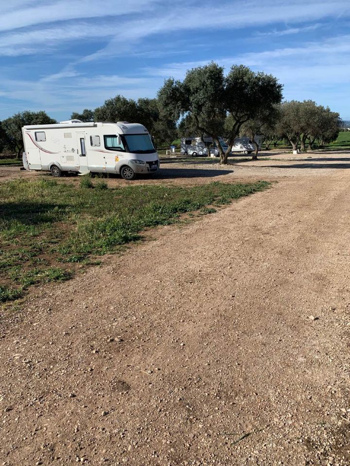 Area di sosta camper con circa una quindicina di piazzole ombreggiate da ulivi, camper service e servizi igienici con docce calde.