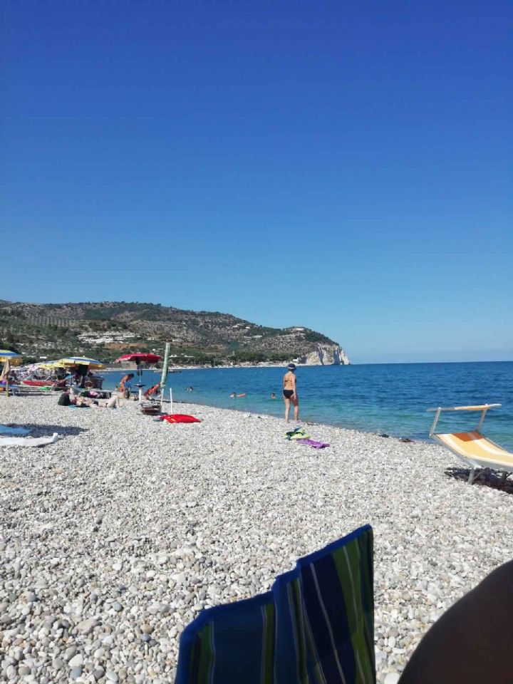 Area sosta adiacente al mare. Non bisogna scendere scalinate per la spiaggia come é solito nei luoghi di Mattinata. Spiaggia con sassolini. Mare bello. Va bene anche per bambini. I più piccoli muniti di salvagente perché l'acqua è subito profonda. Posti per il campeggio ombreggiati da teli. Comodi e giusto spazio. Docce sole 3 a gettoni regolabili. Carico e scarico comodi. Nautico e a cassetta. Pagato a luglio €25,giorno. Tassa di soggiorno 1 euro cad. per adulti. Gestori cordiali. Spiaggia libera. Servizi igienici retrò, ma puliti. Corrente 6 ampere. Personalmente per rilassarsi un po' va bene. Bello il panorama nei dintorni.