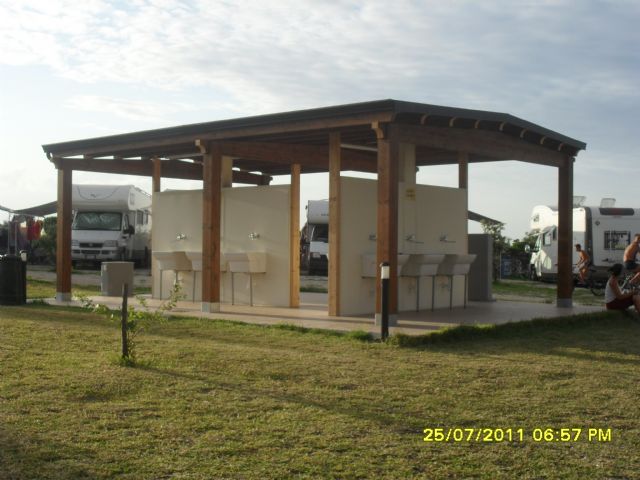 Gestione e professionalità superiori ad un campeggio 5 stelle. Pulizia, piazzole su erba con acqua potabile, vicino al mare con servizio navetta gratuito per le spiagge. Docce a pagamento €1 calda 0,50 fredda e carico e scarico comodo. Costo nella media, consigliato.