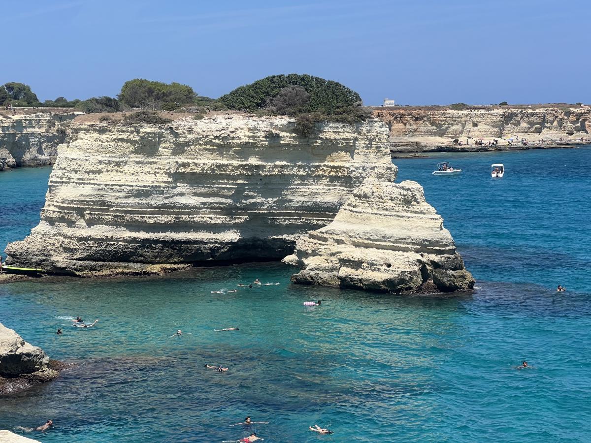 Bellissima area immersa nel verde e sotto una pineta, servizi molto puliti, docce calde a pagamento, tranquilla e rilassante e sopratutto fresca di sera e di notte, a 500 m dai faraglioni di Torre S.t Andrea, a un km dalla bellissima Spiaggia Delle Due Sorelle, raggiungibile con mezzi propri o con bus navetta, a 500 m Torre Saracena con market e tabacchino, consigliatissima.