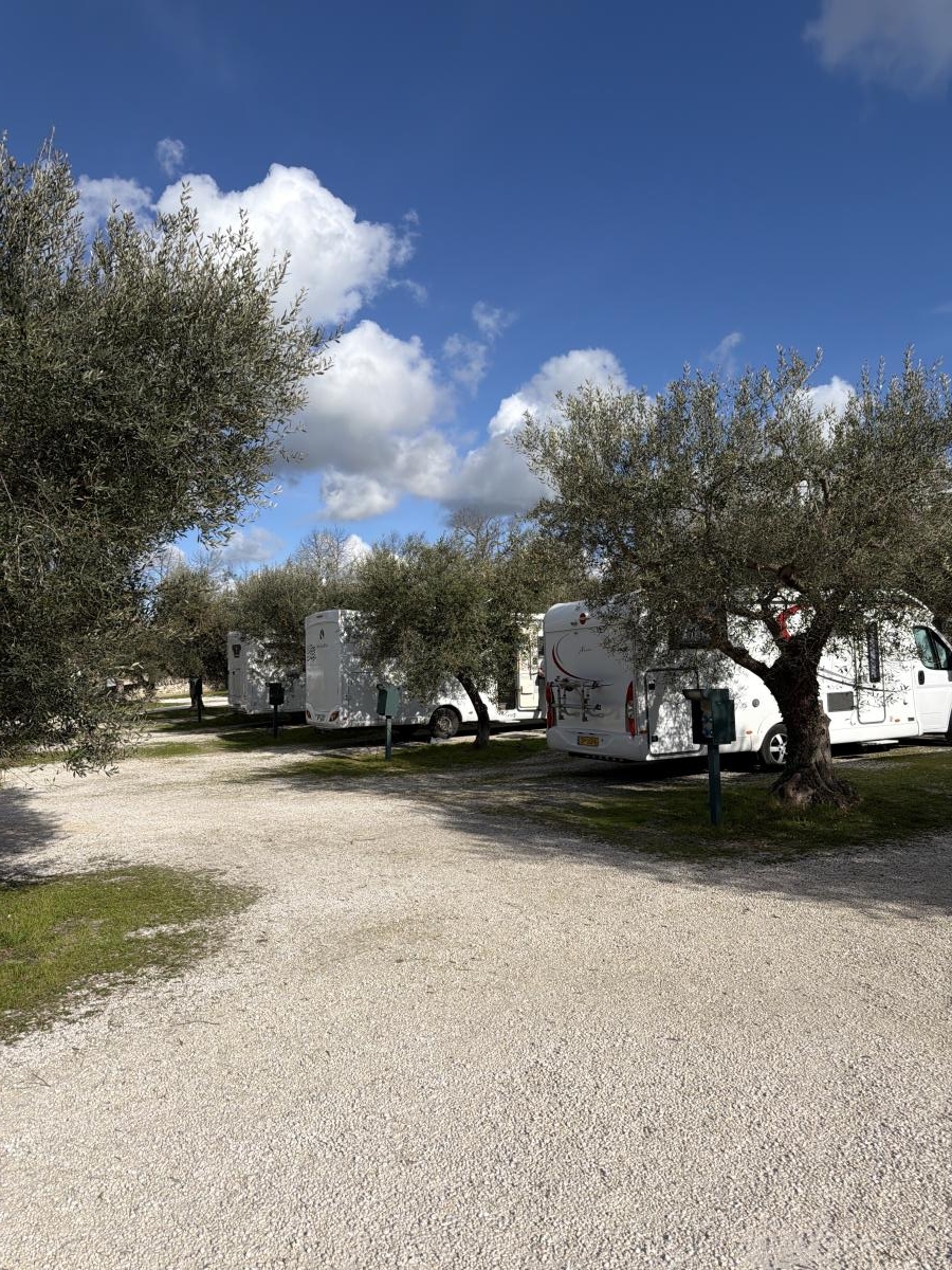 Posizione attigua al centro e silenziosa, ghiaino a terra, in mezzo ulivi, carico e scarico comodi, utilizzabili per camper solo gli stalli situati in basso, causa pendenza. Euro 20 a novembre, elettricità inclusa.Peccato solo che manchi il bidone raccolta umido (devi metterlo a malincuore nel secco) e che - nel nostro caso, causa probabilmente scarso riempimento a novembre (una decina camper) - l'illuminazione generale dell'area di notte non era accesa.