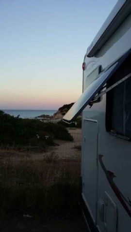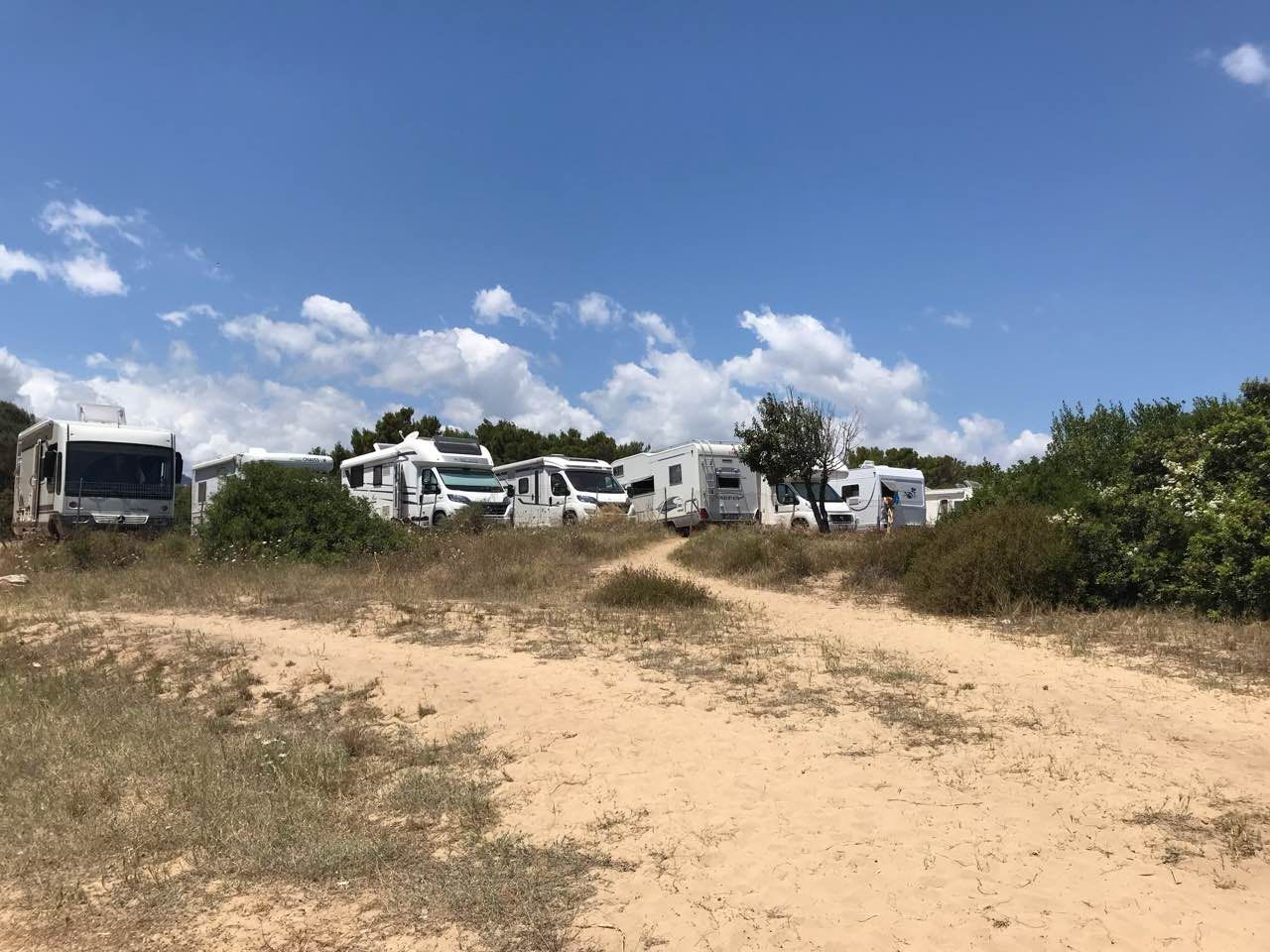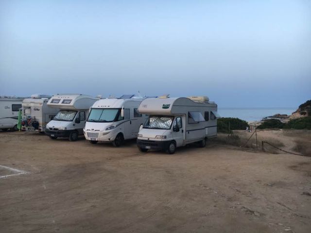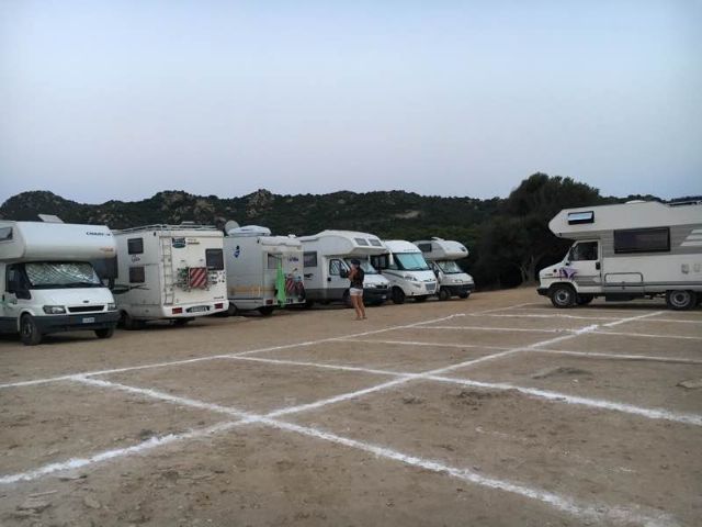 Parcheggio (divieto di campeggio) sterrato senza servizi, assolato, all'estremità sud della cala, presso il chiosco Tamatete, con una decina posti delimitati e riservati ai camper nella zona più vicina alla spiaggia.