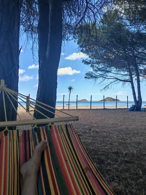 A 1,4 km da Santa Maria Navarrese, area sosta camper e campeggio fronte mare immerso in pineta con 80 piazzole non delimitate, allaccio elettrico da 3-6A, blocchi sanitari con docce calde gratuite, camper service.