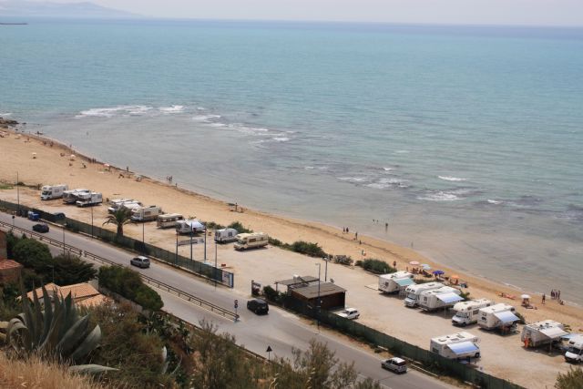 In riva al mare, gode di una vista ed una comoditá alla spiaggia invidiabile. La scala dei Turchi é raggiungibile a piedi direttamente dalla spiaggia. Nessuna possibilitá di ombra. Carico-scarico ed allacciamento elettrico compresi; purtroppo i servizi igienici sono insufficienti, con un solo wc uomo ed uno donna con minuscoli lavandini ed una sola doccia calda a gettone (l'altra doccia calda era guasta). Uno dei pochi posti dove si fa raccolta differenziata dei rifiuti.
