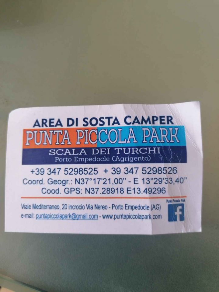 Area sosta essenziale. Bella per via della posizione sul mare e comoda per arrivare alla Scala dei Turchi in 20 minuti a piedi tramite la spiaggia. In linea di massima l'area non è tenuta benissimo, (per esempio i pali che delimitano le piazzole sono per terra). Gestore poco presente, infatti siamo entrati e ci siamo posizionati grazie ad un altro camperista. 24€ a notte (anche se il prezzo segnalato è 20€ .... a quanto pare perché non siamo tesserati con Associazioni di camper), elettricità inclusa.Possibilità di ordinare brioche e cannoli; nell'area spesso viene un'ape con frutta e verdure freschi. Non sono riuscita a pagare con bancomat in quanto... non presente! Forse un disguido per due giorni consecutivi. A soli 15 minuti di camper c'è la Valle dei Templi.
