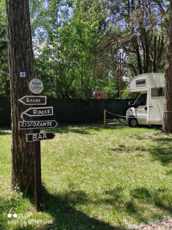 I servizi disponibili: bagni, docce calde a gettone, carico acqua, scarico cassetta WC chimico e acque grigie, area barbecue, wifi gratuito, parco giochi.