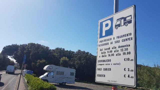 Area camper bruttina, rumorosa al sole, carico e scarico, no elettricità, 10 euro nella stagione estiva compreso carico e scarico, 3 euro solo carico, 4 solo scarico