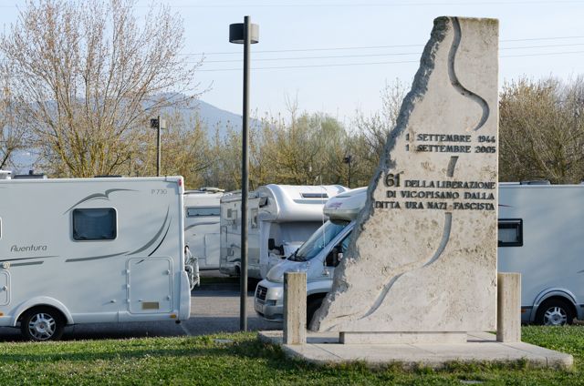 A 1 km dal centro, punto sosta comunale illuminato pianeggiante, su asfalto, alberato e attrezzato con scarico a terra o a colonnina WC-Wash, rifornimento acqua, Wi-Fi gratuito e video-sorveglianza.
