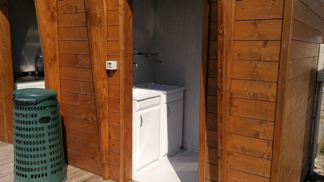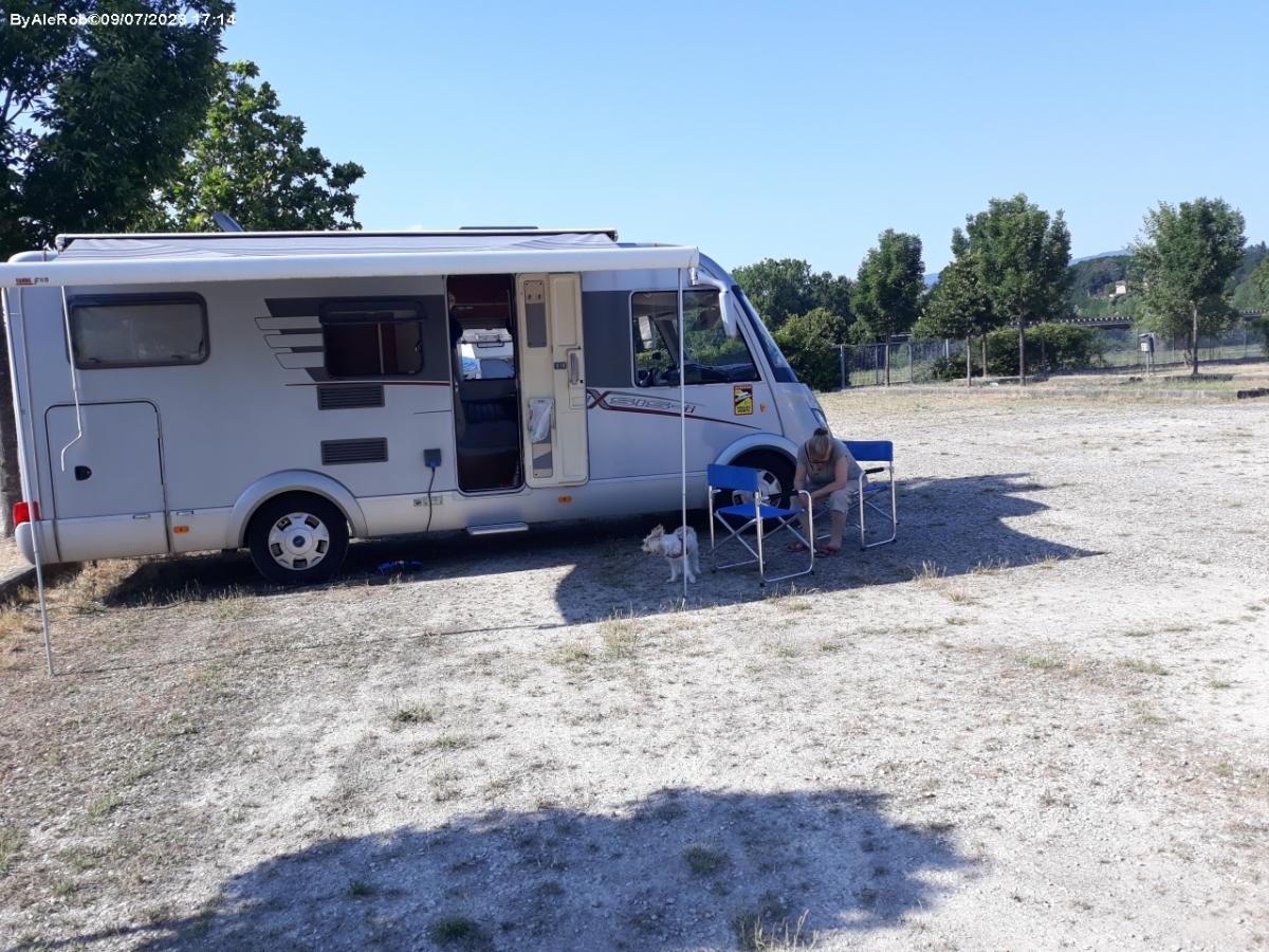Carico, scarico, 220V, bagni, docce, lavatrici, barbecue. Sosta comoda e tranquilla. L’area è priva di ombra, in questo periodo è un prato secco con molta polvere. Con il lago vicino non ci vorrebbe molto a mantenere il prato verde. Per accedere è necessario chiamare il numero di telefono presente sul cancello, da cui si ottiene il codice di accesso. Il pagamento avviene la mattina successiva direttamente al personale. L’area possiede due camper service, entrambi comodi e di facile accesso e utilizzo.