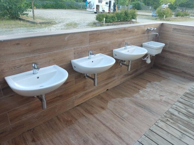 Posto molto carino, costo 15€ a notte con allaccio elettrico, scarico, carico, lavello per i panni, lavelli per le stoviglie, docce - tutto con acqua anche calda.