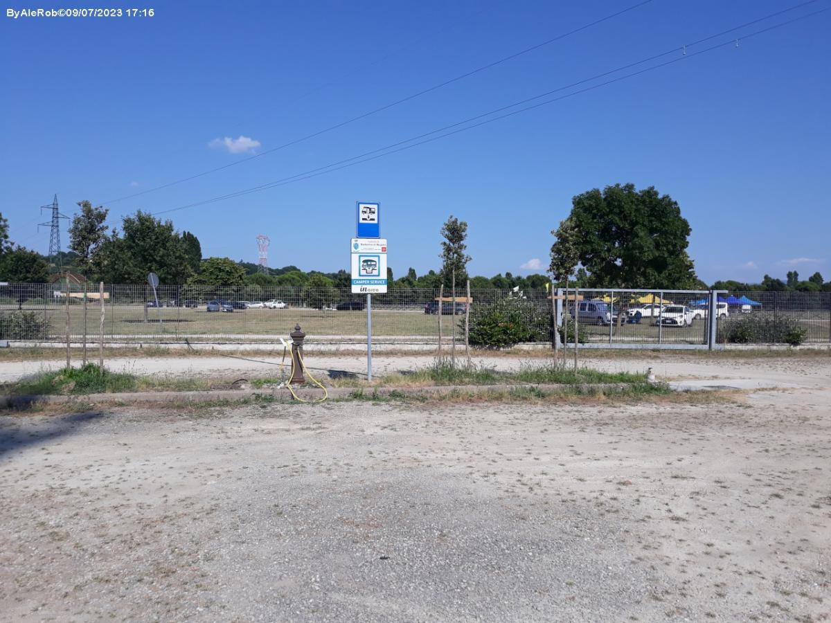 servizi completi a prezzo ragionevole e puliti, grazie anche ai camperisti civili di passaggio; aspettare che gli alberi crescano per fare ombra; unici nei il traffico di via del lago e la recinzione metallica che nasconderei un poco con dei rampicanti; non trovo definizioni inoffensive, quindi mi limito a dire: un po' triste