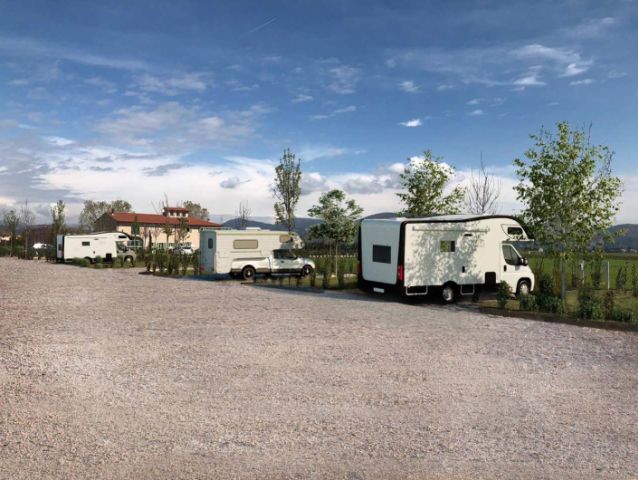 Area sosta delimitata con 15 piazzole dotate di area verde esclusiva, allacciamento elettrico, carico acqua, camper service, copertura WiFi, parcheggio auto. In struttura sono presenti estintore e kit primo soccorso. Possibilità di effettuare la colazione in struttura a € 8,00 a persona (su prenotazione). Animali ammessi.