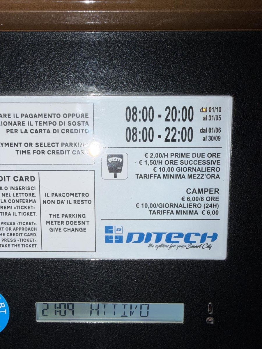 La tariffa è cambiata ed è indicata solo sul parchimetro. 5€ per sosta di 6 ore, 10€ per 24 ore. Si paga dalle 00 alle 24, non sono più indicate fasce orarie.