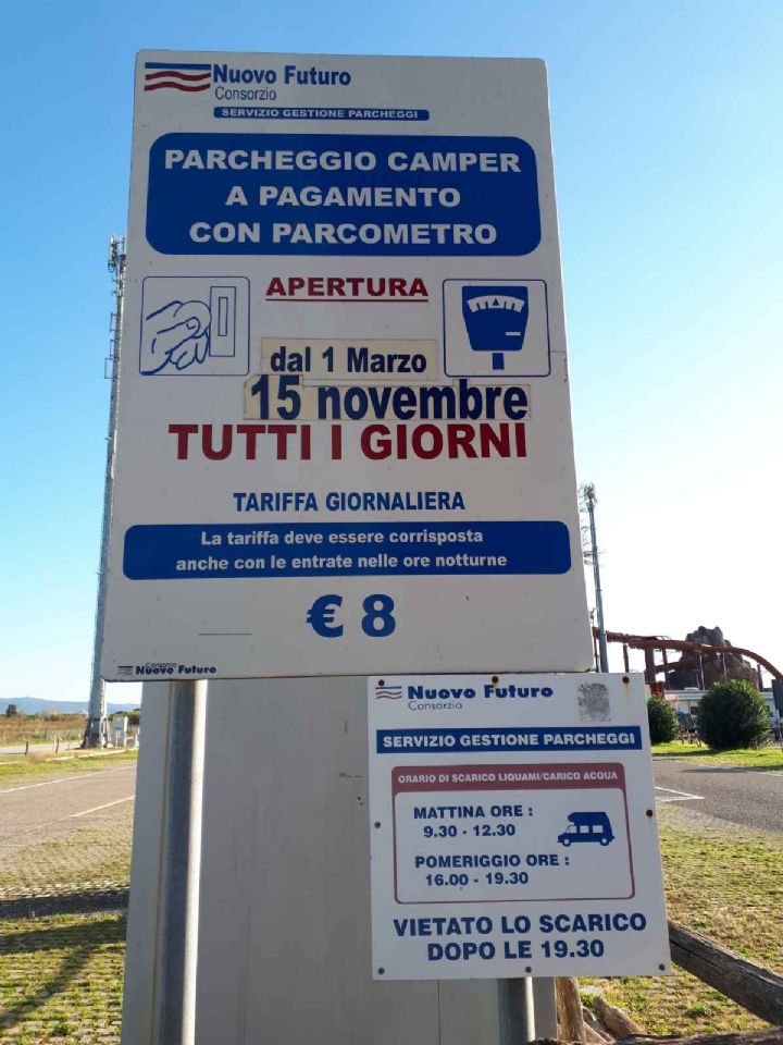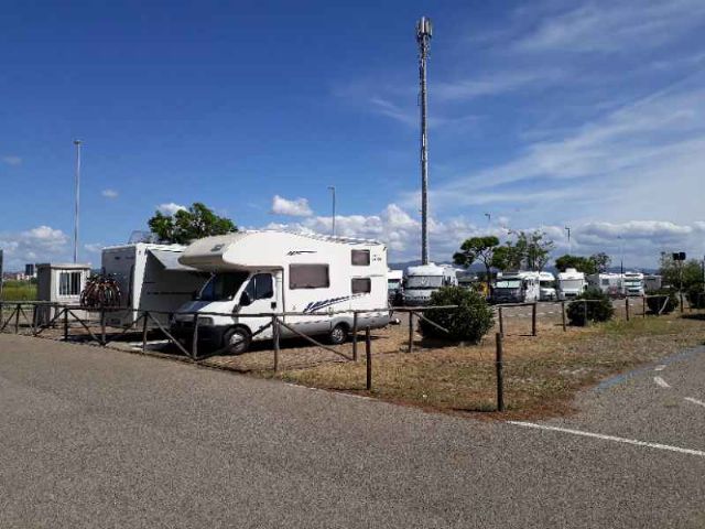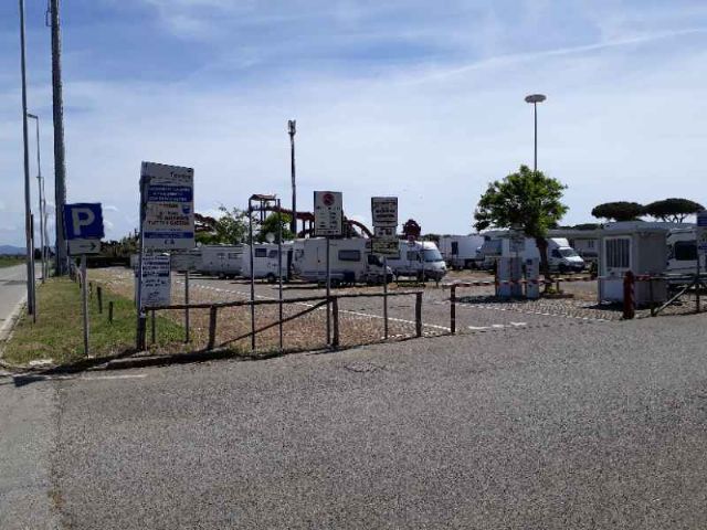Nel parking dell'Aqua Park, a 300m dal mare, a pagamento da marzo a ottobre. Le operazioni di scarico sono possibili solo fino alle 19:00. Il mare si raggiunge in 10 minuti a piedi o in bici.