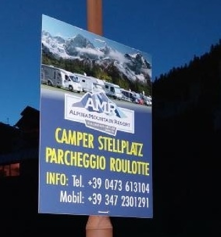 A poca distanza dal centro, area attrezzata di proprietà dell'hotel Alpina Mountain Resort, stalli su ghiaia, pianeggiante, con allacci elettrici, camper service, bagni, docce.