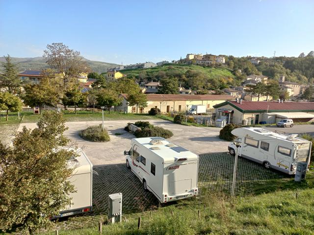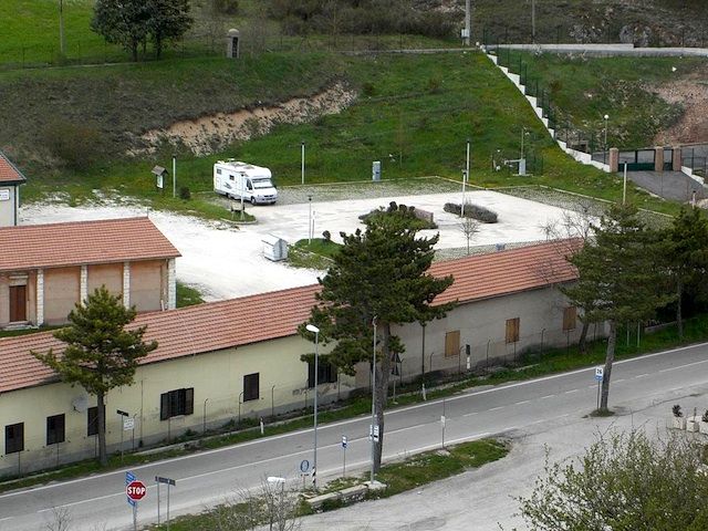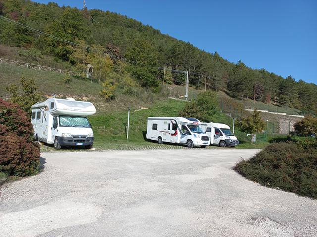 In centro paese, di fronte alla caserma dei Carabinieri, area camper comunale con 15 posti (non adatto a veicoli >7 m) in piano, dotata di colonnine elettriche 10A. L'accesso all'area è a pagamento e comprende luce e acqua (l'erogazione di acqua viene interrotta nel periodo invernale a causa del clima rigido). E' possibile accedere all'area a qualsiasi ora del giorno e della notte, il biglietto per la sosta va regolarizzato tramite l'apposito parchimetro o presso la sede del Parco di Colfiorito che funge anche da Infopoint turistico.