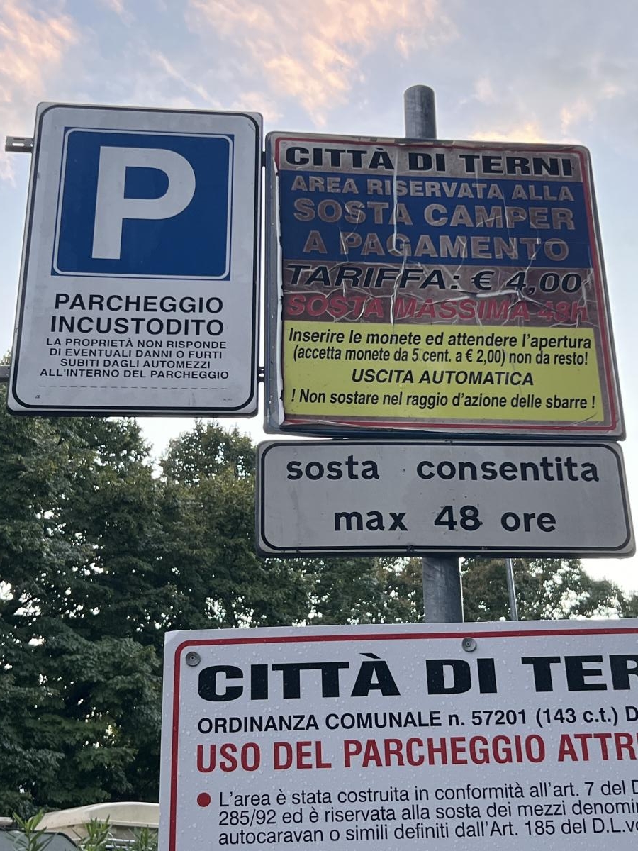 Area sosta pulita e ben tenuta, ombreggiata, vicinissima al centro a 200m da comando CC di Terni. Euro 4 /48h, corrente euro 1/12, CS a 50 centesimi. Unico neo, rumorosa per strada adiacente.