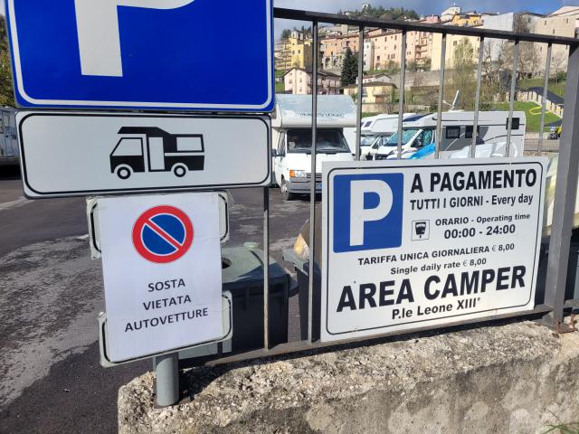 Carico, scarico, allaccio elettrico. Area organizzata, con posti delimitati, di dimensioni adeguate ai soli mezzi. Pagamento alla colonnina automatica o all’ufficio posto alla base delle scale mobili. Camper service artigianale, scarico nere solo per cassette, carico dalla fontanella dello scarico grigie.