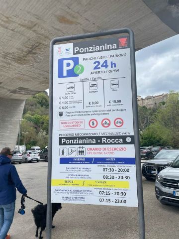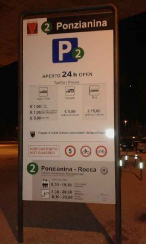 Parcheggio misto auto e camper. Assolato e poco ventilato. Prossimo alle scale mobili per la visita del centro. Parchimetro dall’aspetto molto moderno, predisposto per il pagamento con banconote e carte di credito, ma accetta solo monete.