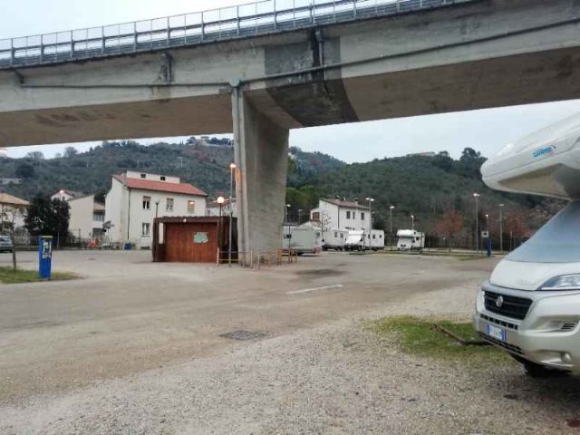 Molto comodo perché vicino alle scale mobili, ma rumoroso la notte a causa di cani che abbaiano tutta la notte e del ponte sopra la testa. Per 800 mt in più conviene andare a Via dei Filosofi - Campo Boario N 42.746600, E 12.731800 che ha anche C/S ed è anche gratuito!