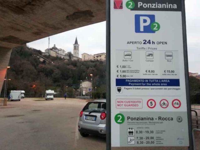 Vicinissimo alle scale mobili che portano sia alla rocca che al Duomo (quindi centro), solo parcheggio, no servizi. Arrivare presto perché è misto auto e camper. Spesso le auto usano anche i posti camper. La notte purtroppo è un po' rumoroso per via della superstrada sopra il cavalcavia.