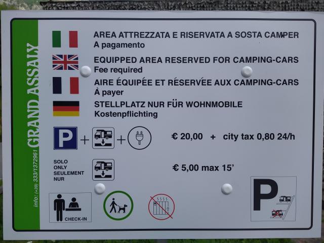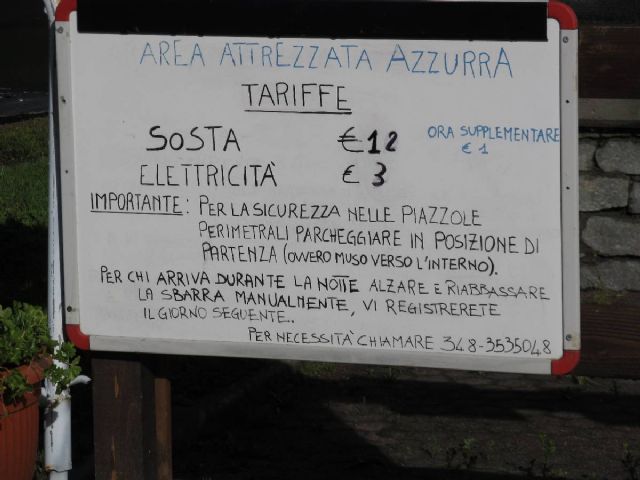 Piazzole ben pulite, ma molto molto strette: tra un camper e l'altro ci saranno 60 cm. Servizi funzionali e puliti, docce a pagamento (euro 1 per 4 minuti). Costo 20 euro, con allaccio corrente incluso.