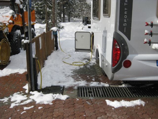 Bella struttura con fontana, carico acqua con tubo, scarico cassetta, nautico e grigie.. tutto funzionante anche in pieno inverno. A 5 minuti a piedi ristorante/pizzeria, a 8 minuti dagli impianti e 15 dal centro. Comoda la navetta gratuita (almeno nel ponte dell'Immacolata) che ferma all'ingresso.