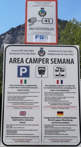 L'area sosta camper esiste ma è diventata un comune parcheggio riservato e a pagamento. Il costo è irrisorio (in pratica 10 euro dalle 9 alle 19) ma non esistono più i servizi caratteristici dell'area di sosta ovvero il carico e scarico (fondamentali) e l'allaccio alla corrente (opzionali). Peccato, considerato che fino a pochi anni fa' non era così. Sarebbe carino sentire dal comune di Pré-Saint-Didier il perché di questa scelta!