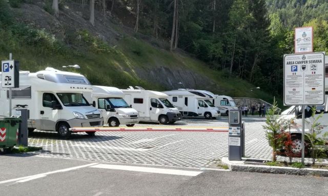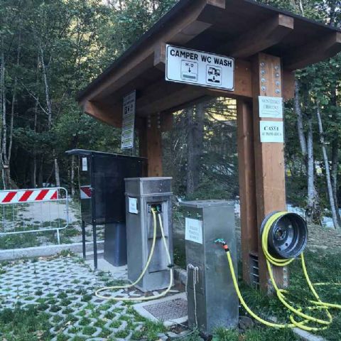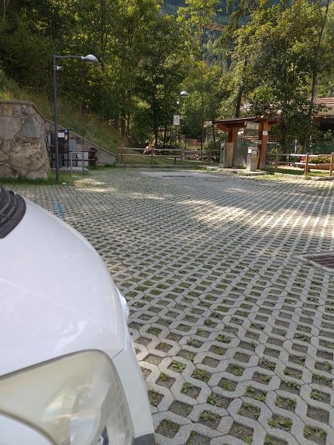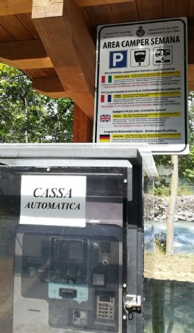 Parcheggio con pagamento automatico, carico acqua, scarico acque nere e grigie, corrente elettrica e stalli ampi. Vicino a sentiero per orrido e terme.