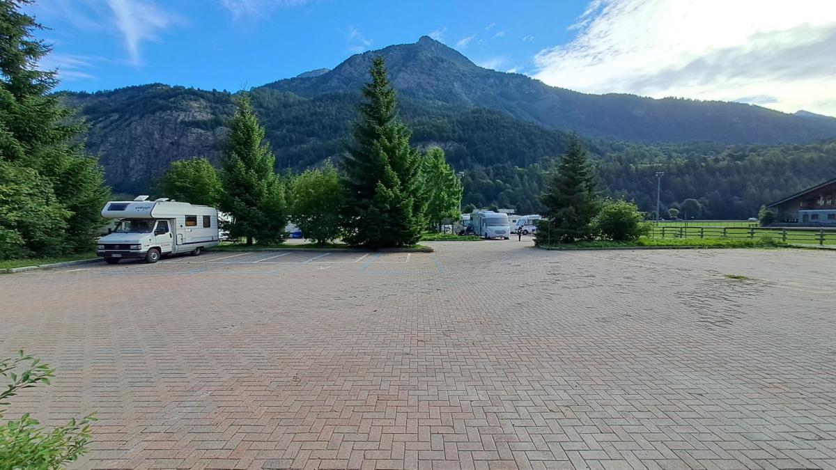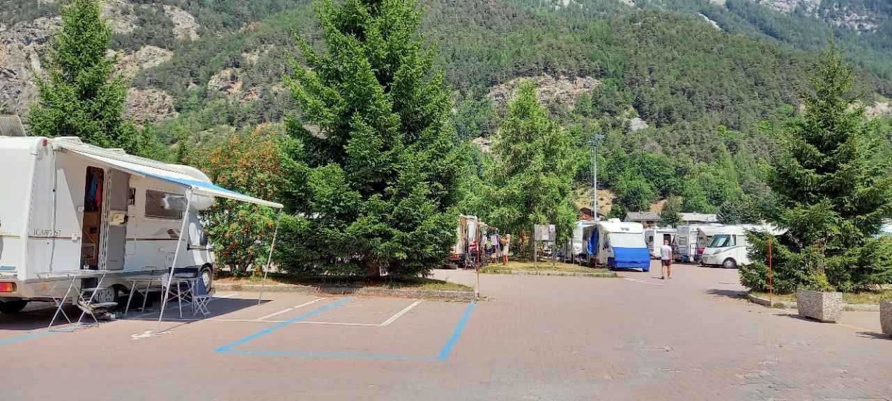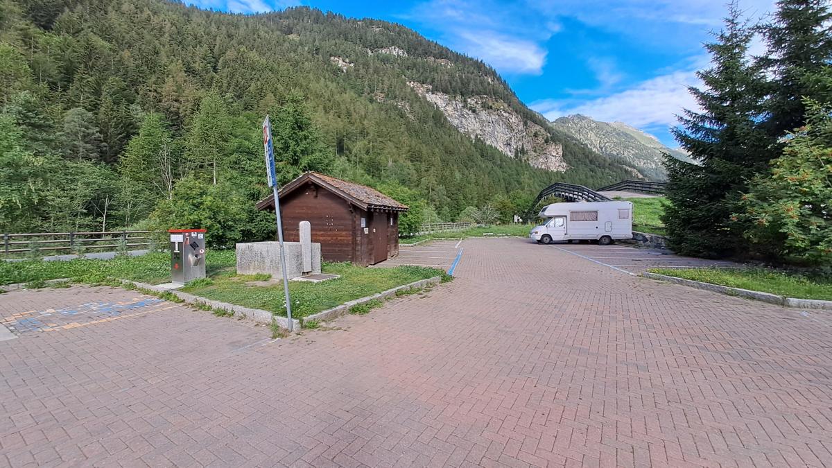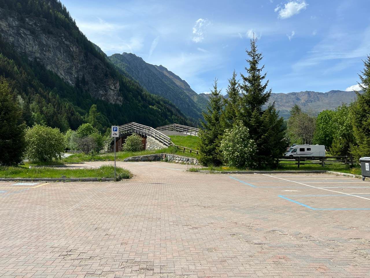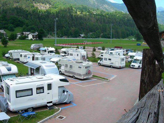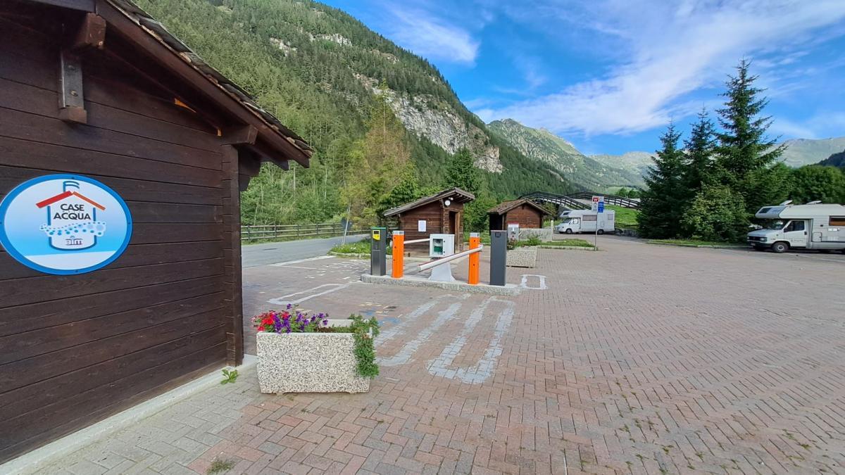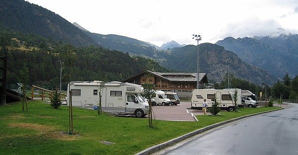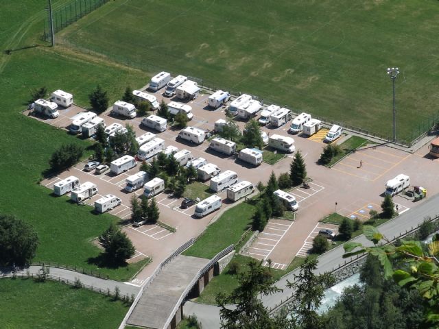 A 1,5 km dal centro e a 700 m dal lago, area comunale per camper lungo il torrente Evancon, segnalata con accesso tramite sbarra, rilascio tessera (cauzione) per accesso e pagamento, stalli su autobloccanti, allacciamento elettrico (non per tutte le postazioni), camper service.
