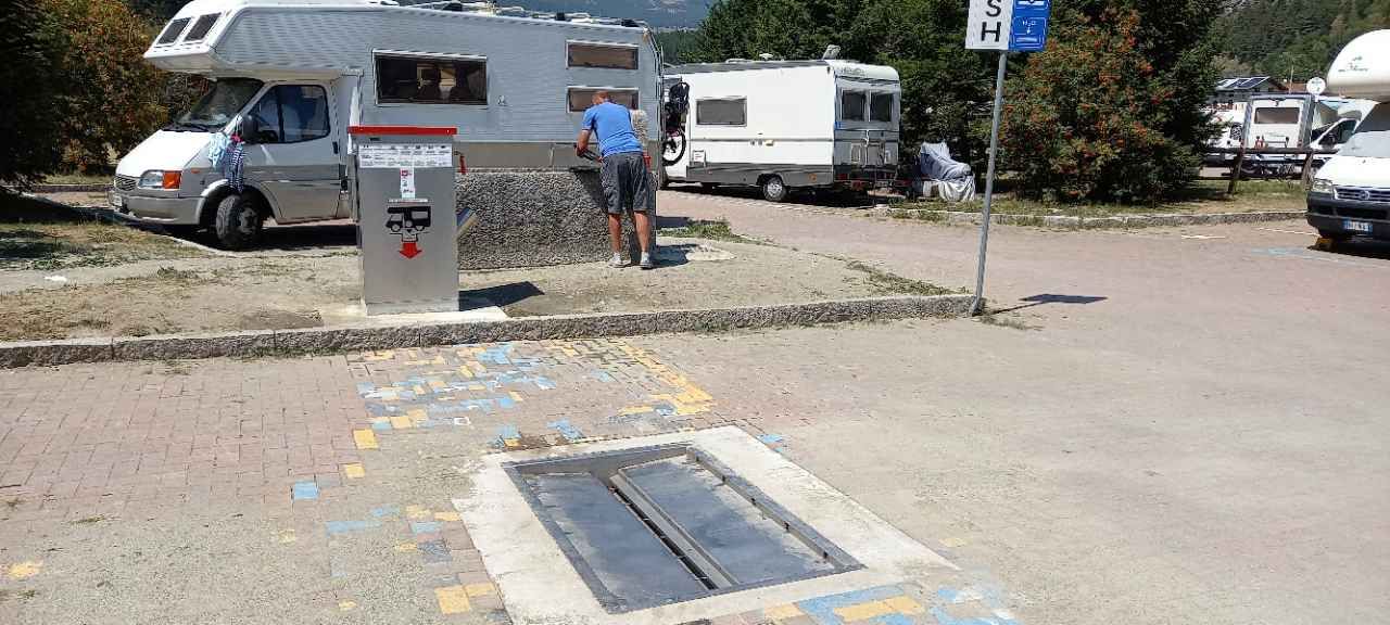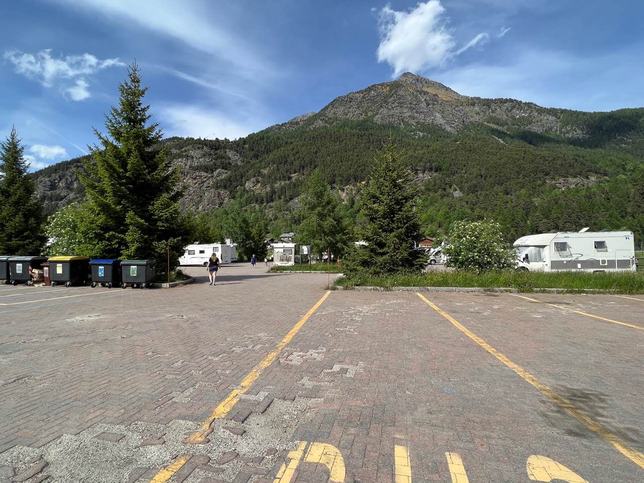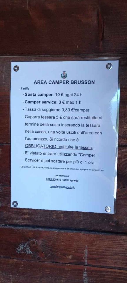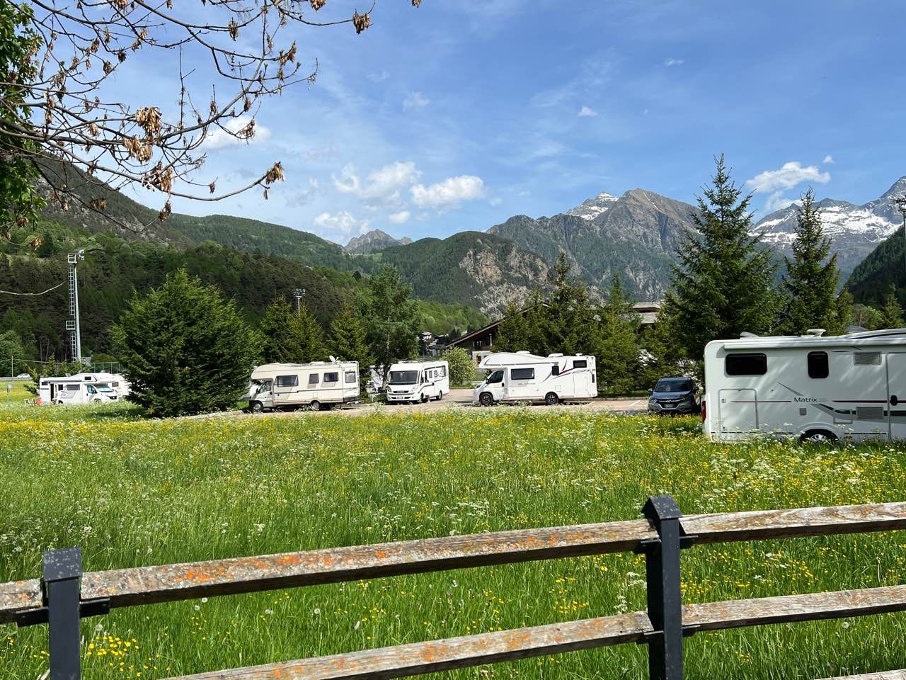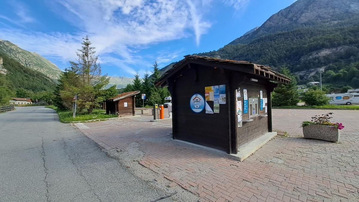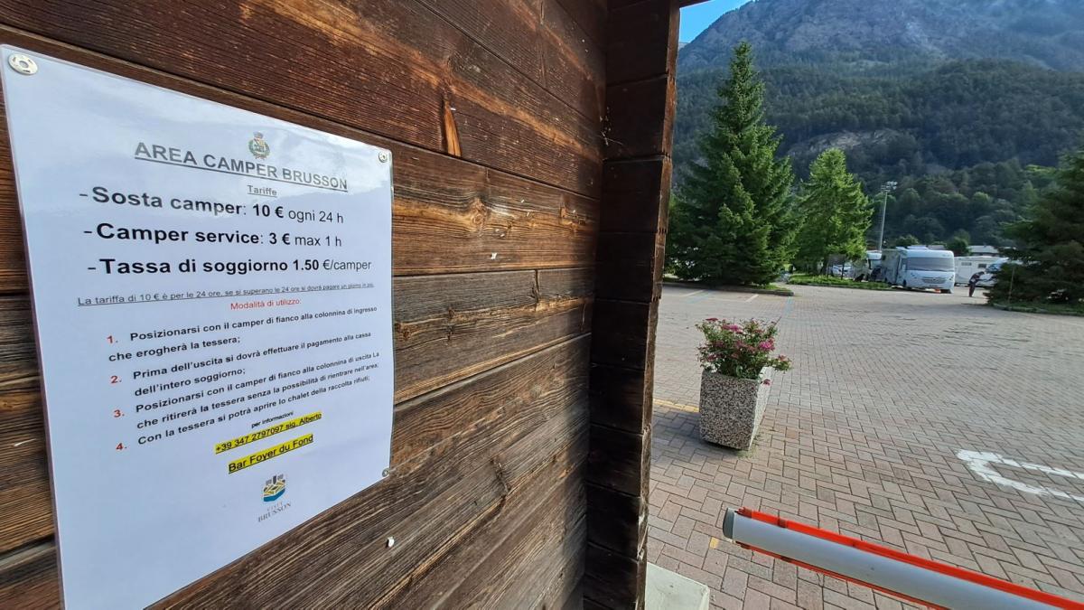 A 1,5 km dal centro e a 700 m dal lago, area comunale per camper lungo il torrente Evancon, segnalata con accesso tramite sbarra, rilascio tessera (cauzione) per accesso e pagamento, stalli su autobloccanti, allacciamento elettrico (non per tutte le postazioni), camper service.